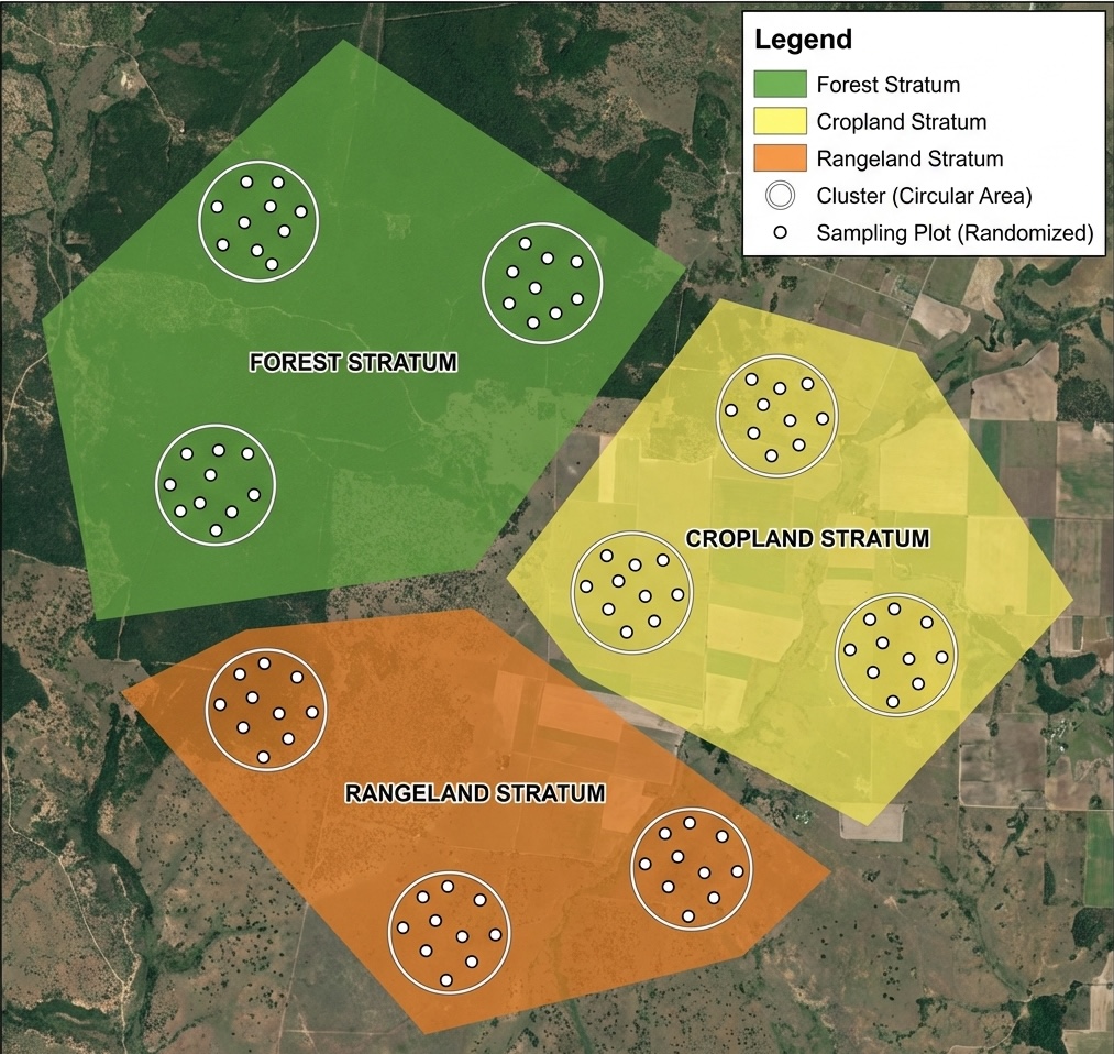 - Clusters: The basic sampling unit remains a cluster, typically covering a 1 km² area. Cluster centroids are randomized within the chosen strata.